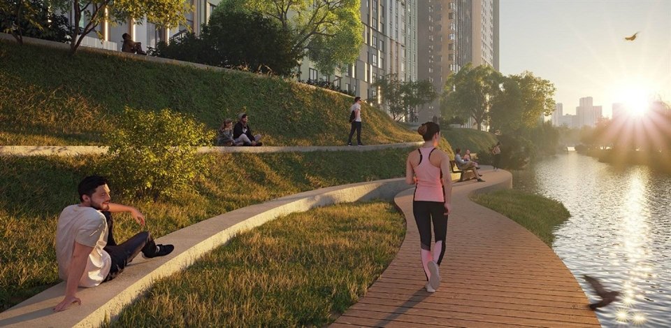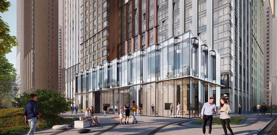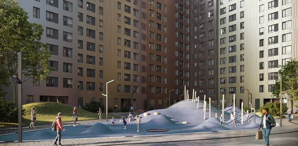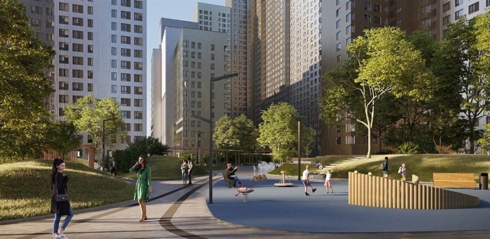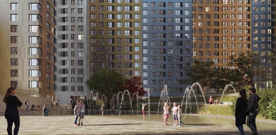 Создатели решили нетривиальную задачу: спроектировали высотный комплекс, не довлеющий над человеком. Просторы внутреннего парка затмевают собой многоэтажность корпусов. Высота секций снижается ближе к пешеходным бульварам, так что гуляющие жители визуально контактируют с более низкими домами. Входы на территорию оформлены как площади: эти буферные общественные пространства делают комфортным переход от шумной городской улицы к тихому, приватному двору.
